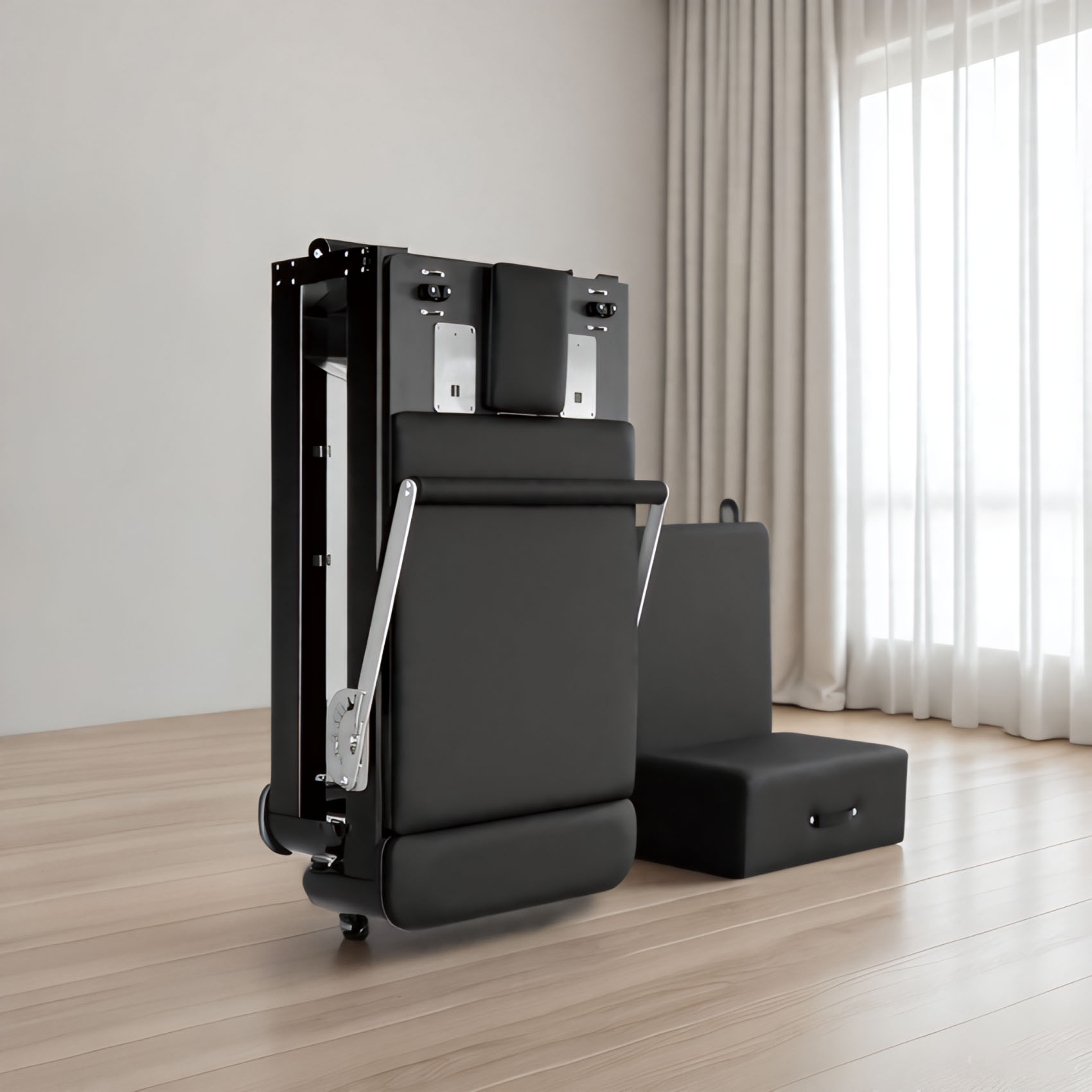 Der Pilates-Reformer lässt sich leicht zusammenklappen und platzsparend verstauen.