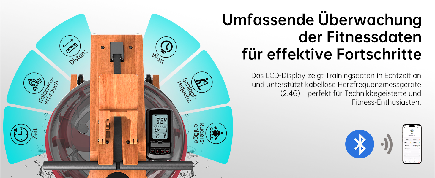 - Bluetooth & LCD-Display – Kompatibel mit Kinomap, misst Zeit, Distanz, 500-Meter-Zeit, Kalorienverbrauch, Watt, Ruderschläge und Schlagfrequenz anzeigt in Echtzeit.