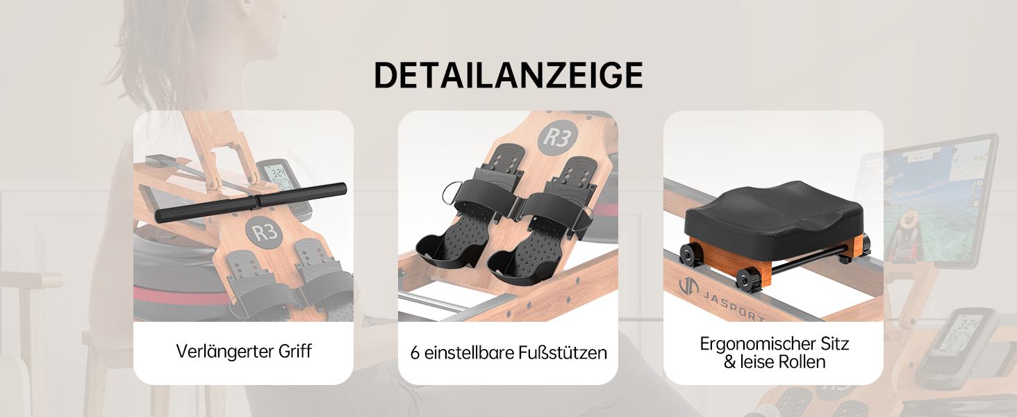 - LCD-Display mit umfassender Überwachung der Fitnessdaten Der JASPORT R3 ist mit einem LCD-Display ausgestattet, das in Echtzeit wichtige Trainingsdaten wie Zeit, Distanz, 500-Meter-Zeit, Kalorienverbrauch, Watt, Ruderschläge und Schlagfrequenz anzeigt. Diese Funktionen ermöglichen eine präzise Überwachung Ihres Trainingsfortschritts und helfen Ihnen, Ihre Fitnessziele effektiv zu erreichen.
