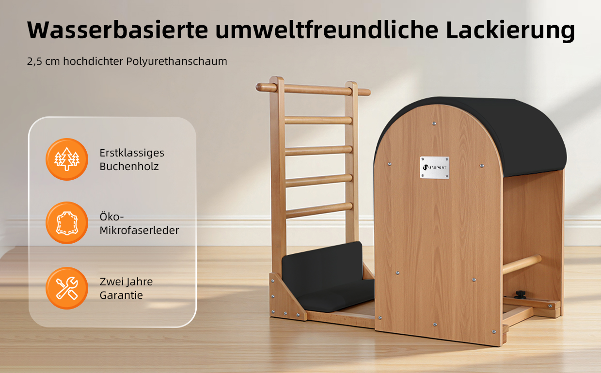Das Pilates-Gerät besteht aus Buchenholz und eignet sich sowohl für den Heimgebrauch als auch für den professionellen Studioeinsatz. Die spezielle Lederoberfläche ist reißfest, abriebfest, alterungsbeständig, atmungsaktiv und angenehm kühl.
