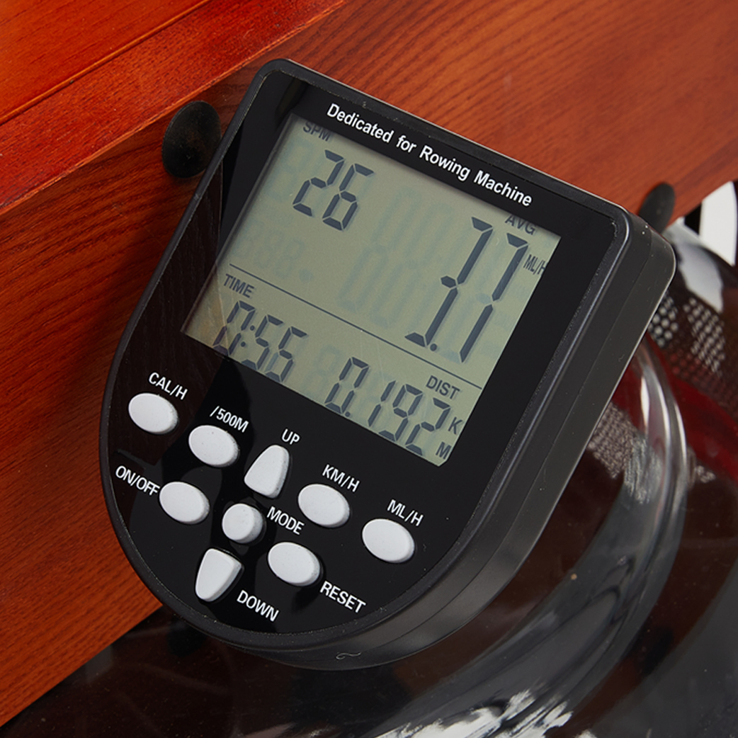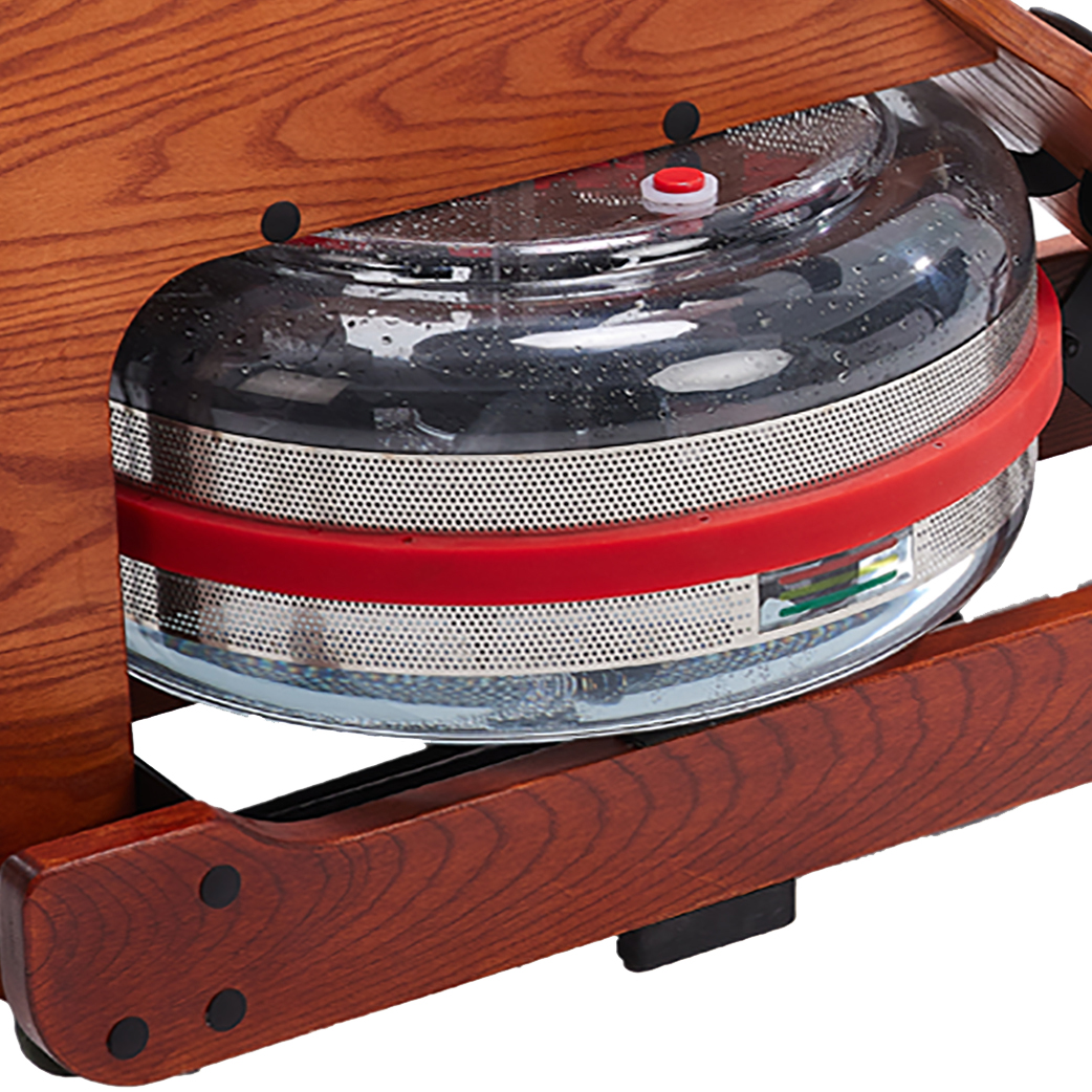 Der Wassertank dieses Rudergeräts ist mit einem robusten und ansprechenden Edelstahlring verziert. Der Tank selbst besteht aus Polykarbonat, und das neu gestaltete Design mit Edelstahlringen erhöht die Haltbarkeit erheblich. Dies trägt dazu bei, die ästhetische Schönheit und Funktionalität in einem hölzernen Rudergerät zu vereinen.
